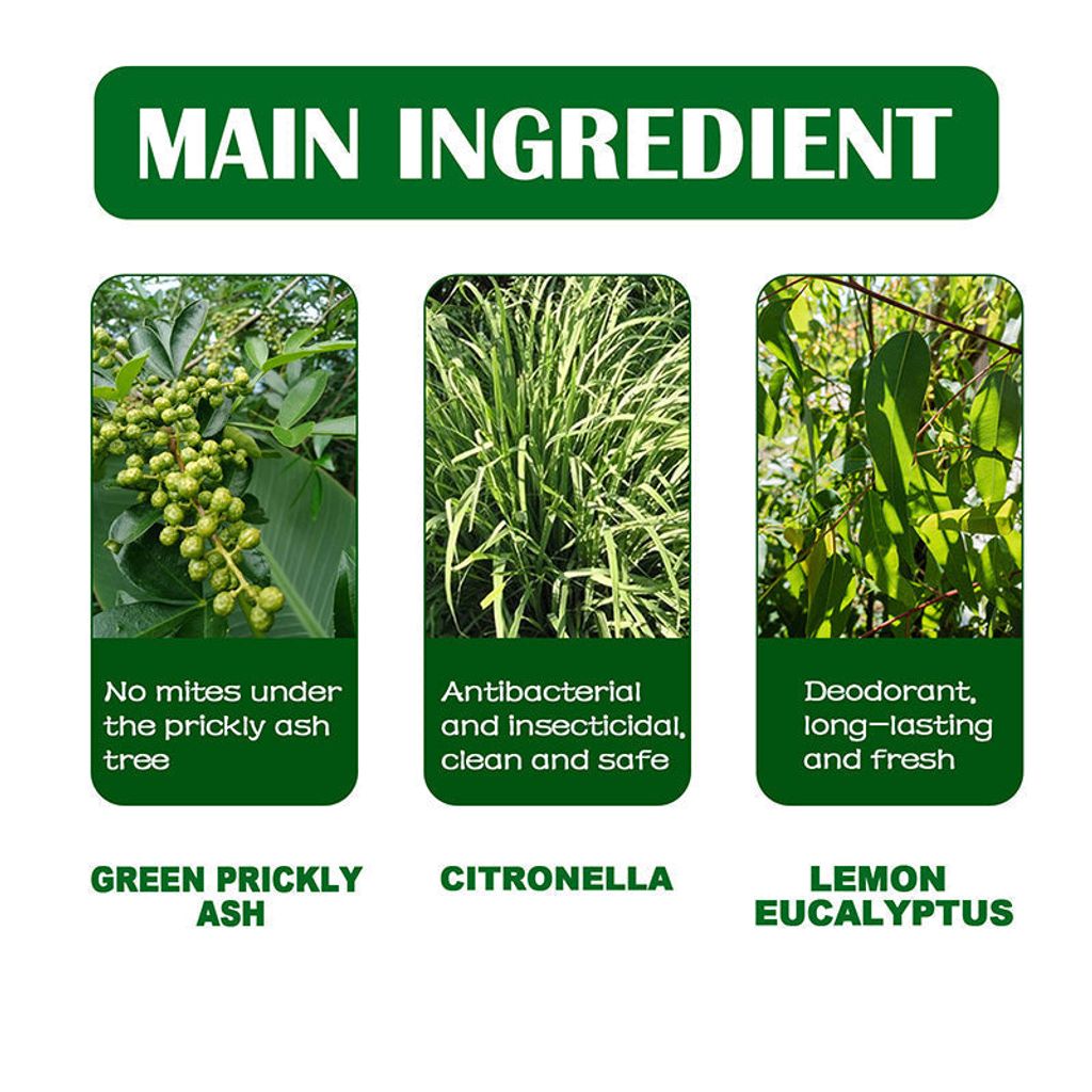 NATURAL INGREDIENTS - We extract the essence of plants where mites cannot survive. Citronella is added for its antibacterial and insecticidal properties. Lemon Eucalyptus is included for deodorant effect. The formula is safe and non-toxic.